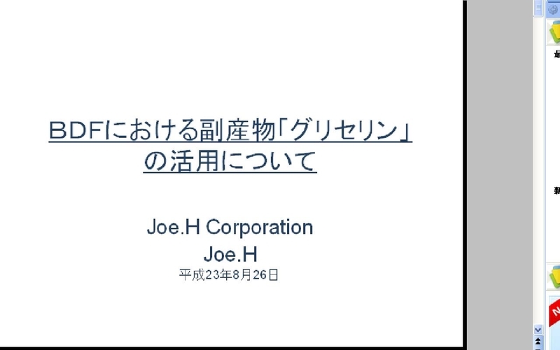 2011-08-28 BDFにおける副産物グリセリンの活用について(1) 無題 #化学 下記は、今月26日に「くまもとのECO燃料拡大推進研究会」に於いて「副産物グリセリンの利用法」について話をする様に依頼がありましたので、私の実践しているグリセリン石鹸を中心にお話をさせていただきました。その際に利用したパワーポイント(コピー)です。 参考までに添付します!! 類似の内容は、本Blogの記事中にもありますので、併せて参照ください。 掲載図の容量制限から、次に続く( http://blogs.yahoo.co.jp/hirai476/13701638.html )
