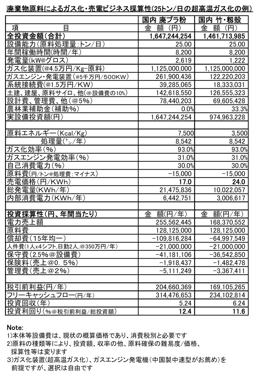 尚、此れらの諸製品より安価な商用化ガス化装置(FIT対応可能な)製品(例えば、1KW当たりの設備単価)があれば、是非ご教示ください