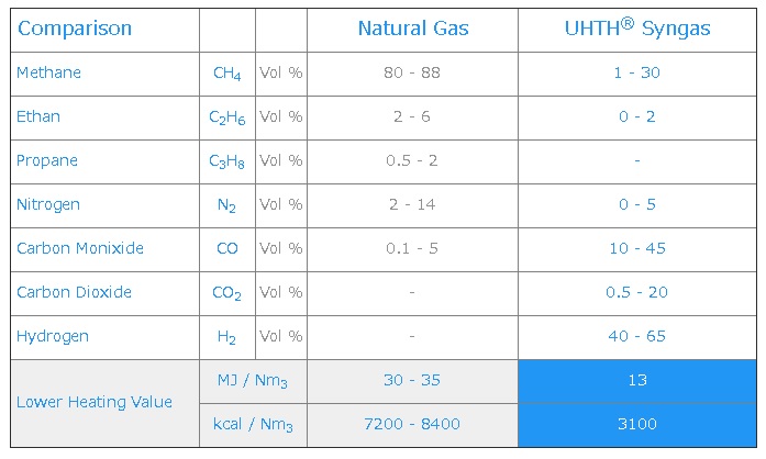 通常の空気を使うSynGasの様に40~50%の窒素ガスが含まれていません。空気の代わり酸素を使うガス化装置で出来る合成ガスと等価の合成ガス・エネルギーが得られます。